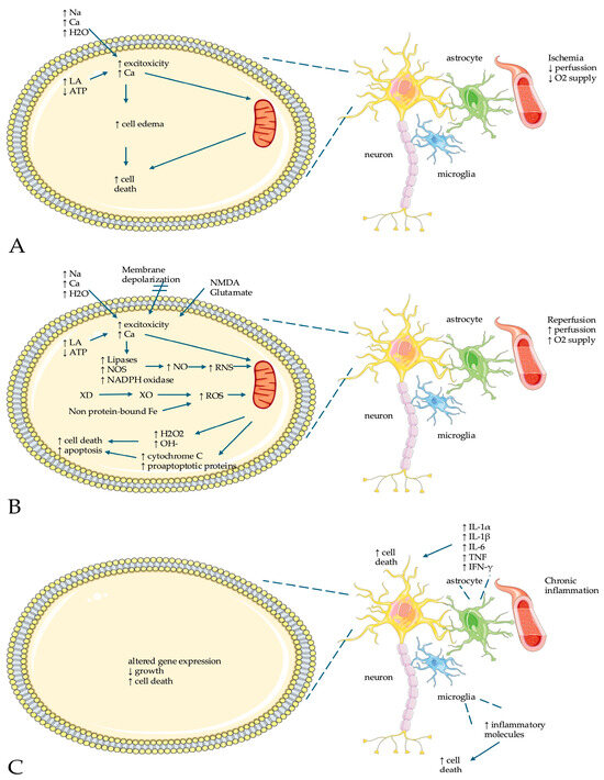 The third stage, which can continue for several days or even weeks, is marked by inflammation and altered gene expression that result in defects in the formation of new neurons, the development of synapses, and the growth of axons [50,51]. Oxidative stress interacts with the immune system, creating a “vulnerability period” for NE. Initially, oxidative stress is triggered by immune cells at the site of residence, such as microglia. These microglia are highly responsive to hypoxia/ischemia and are activated by an increase in NO, glutamate, and ROS, leading to the production of a large number of inflammatory molecules [52]. Astrocytes are also activated, producing interleukins (IL-1α, IL-1β, IL-6), tumor necrosis factor-alpha, and interferon-gamma, which hinder the growth of new neurons, directly damage immune cells, and cause neuronal cell death [53].
