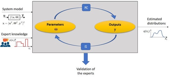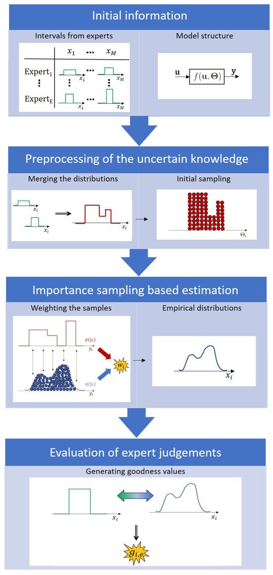 The gained probability distributions make it possible to estimate the parameters and outputs of the system if the model structure is known. The system outputs can be evaluated by a Monte Carlo (MC) simulation using the expert-based probability distributions of the parameters and the system model, and the results can be compared to those suggested by the experts. Thus, the consistency of the expert knowledge about the parameters and outputs can be examined. Based on the probability distributions of expert-based outputs, the parameters can be estimated by the importance sampling (IS) technique. Executing these two steps iteratively, the imprecise information of the parameters and outputs can be brought to a consensus, and the calculations converge to a result in the form of probability distributions, as seen in Figure 1.