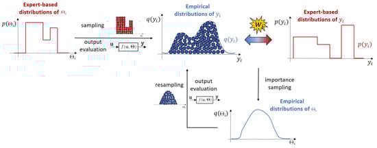 Using these pieces of information, the parameters of the model can be estimated by an iterative technique: the sample elements of the output obtained by the MC simulation are weighted ( w i ) by IS; thus, new empirical probability distributions of the parameters are generated, and new samples are drawn from them. Then, the output is calculated again for every sample element. These steps are repeated until the results converge. An outline of the procedure can be seen in Figure 4.