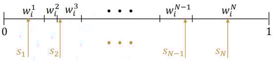 Figure 5. Schematic figure of resampling. The generated s n ( 0 , 1 ] random numbers are represented by orange arrows and the weights of the sample elements are denoted by w i j ( j = 1 , , N ). If an arrow points to the interval of w i m , x i m is chosen as new sample element.
