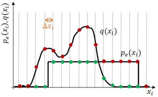 Figure 6. Comparison of two probability distribution by calculating the Jaccard index. The p e ( x i ) and q ( x i ) distributions are discretized by Δ x i and probability density functions are evaluated at that points. The elements two datasets are compared pairwise: the maximum and minimum values are denoted with red and green color, respectively. Then, Equation (12) is used to calculated Jaccard index, which is the ratio of the areas under the red and green curves, actually.