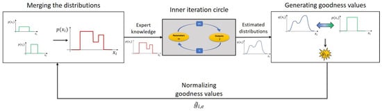 Figure 2 outlines the methodological background of this paper, whose elements are introduced in detail in this section. The system model and expert assessments are available as initial data. The uncertain expert knowledge about the parameters and outputs has to be represented mathematically and transformed into probability distributions. These pre-processing steps are described in Section 2.1. The proposed methodology that uses MC simulation and IS to handle expert knowledge and estimate the most likely probability distributions of the parameters and outputs based on it is introduced in Section 2.2. To evaluate expert judgments, the distributions created from the intervals provided by them are weighted compared to the estimated distributions; thus, goodness values ( g i , e ) are generated, which can be used to eliminate incorrect expert judgments, as is described in Section 2.3.