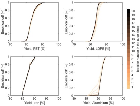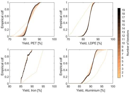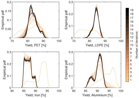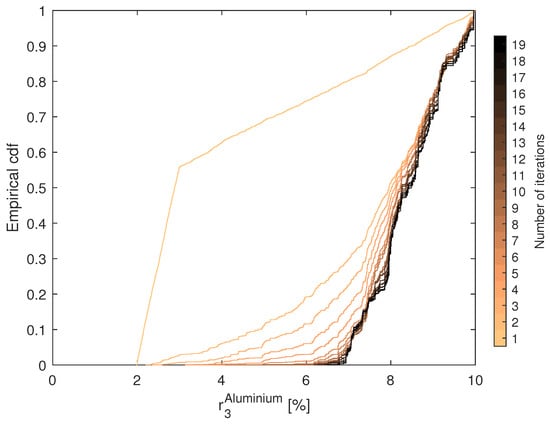 The new samples are handled with equal weights. In the present work, more parameters are needed to estimate; thus, all of them are resampled and assigned to the sample elements independently. Then, the results are calculated again for each sample element and the iteration seen in Figure 4 is executed until the empirical distributions converge.