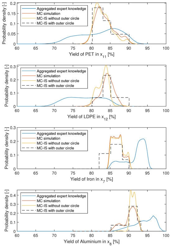 As presented in Section 2.1, the estimated outputs are available as sample densities from the MC simulation. Empirical probability density functions (pdf) fitted to these will serve as the so-called importance functions or proposal distributions, denoted q ( y i ) in Figure 4 where y i is an element of the output vector ( y ). The expert-based distributions used for the comparison are indicated by p ( y i ) , as seen in Figure 4.
