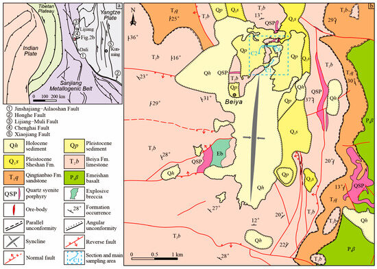 The regional geological setting (a) and geology of the Beiya deposit (b) (modified after Liu et al. [27]).