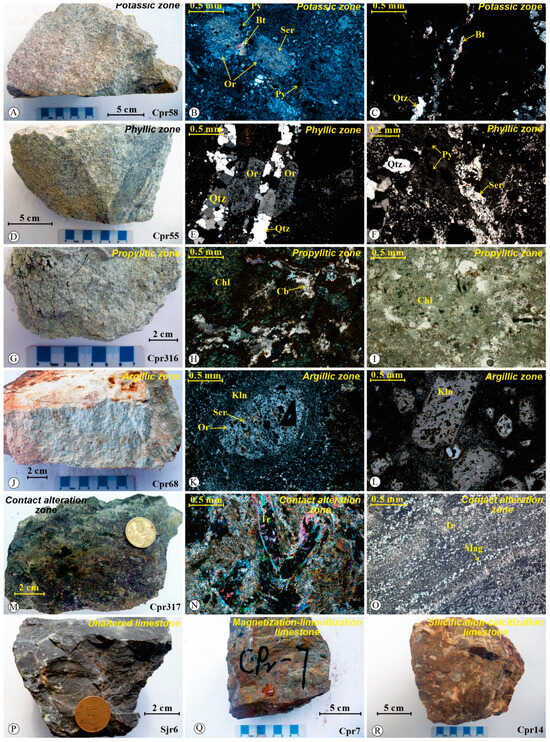 Alteration characteristics in the Beiya deposit. (A)—potassic alteration QSP, with light red to pink in color; (B)—hydrothermal orthoclase (K-feldspar) and hydrothermal biotite occur, and the hydrothermal orthoclase are replaced by the later sericites; (C)—hydrothermal biotite fill in fracture; (D)—phyllic alteration QSP; (E)—quratz occur in fracture and cut the previous orthoclase; (F)—quartz, sericite, and pyrite are developed in phyllic zone; (G)—propylitic alteration QSP, with light greenish in color; (H)—chlorite and some carbonate minerals are developed in propylitic zone; (I)—chlorite replace groundmass; (J)—argillic alteration QSP; (K)—kaolinite metasomatize orthoclase along the edge; (L)—kaolinite completely metasomatize plagioclase; (M)—endoskarn, with greenish-gray in color; (N)—tremolite are developed in skarn; (O)—tremolite and magnetite are developed in skarn; (P)—unaltered limestone of the Beiya Fm.; (Q)—magnetization and limonitization limestone of the Beiya Fm.; (R)—silicification and calcitization limestone of the Beiya Fm. Bt = Biotite, Or = Orthoclase, Ser = Sericite, Qtz = Quartz, Chl = Chlorite, Cb = Carbonate mineral, Kln = kaolinite, Tr = Tremolite, Py = Pyrite, Mag = Magnetite.