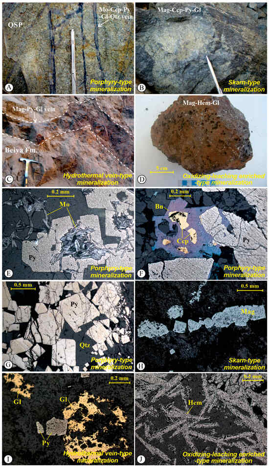Mineralization characteristics in the Beiya deposit. (A)—porphyry-type mineralization, Au-containing molybdenite, chalcopyrite, pyrite and quartz occur in veins or veinlets; (B)—skarn-type mineralization, Au-containing magnetite, chalcopyrite and pyrite occur in massive structure; (C)—hydrothermal vein-type mineralization, Au-containing magnetite and pyrite occur within fracture in the Beiya Fm. limestone; (D)—oxidizing-leaching enriched-type mineralization, Au-containing magnetite and hematite generate in honeycomb structure; (E)—porphyry-type mineralization, molybdenite coexist with pyrite; (F)—porphyry-type mineralization, bornite coexist with chalcopyrite and pyrite; (G)—porphyry-type mineralization, pyrite coexist with quartz; (H)—skarn-type mineralization, magnetite occur in vein; (I)—hydrothermal vein-type mineralization, gold coexist with pyrite; (J)—oxidizing-leaching enriched-type mineralization, hematite are developed. Mo = Molybdenite, Ccp = Chalcopyrite, Py = Pyrite, Gl = Gold, Mag = Magnetite, Hem = Hematite, Bn = Bornite, Qtz = Quartz, QSP = Quartz syenite porphyry, Beiya Fm. = Beiya Formation limestone.