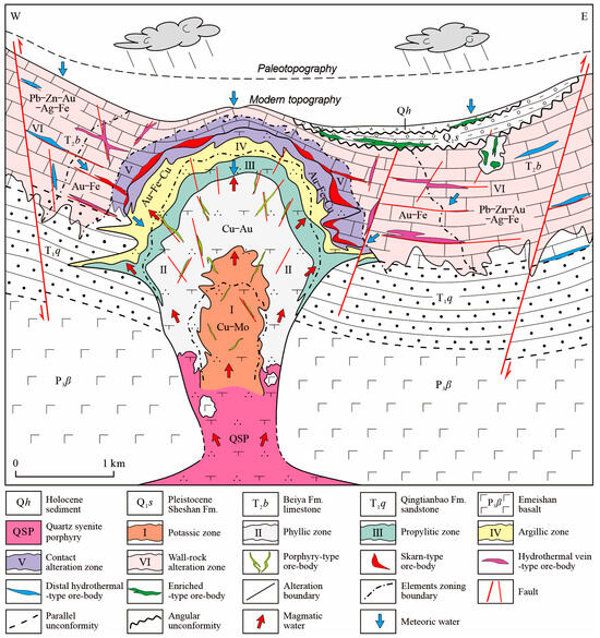 Porphyry deposits are important sources of the metals Cu, Mo, Au, Ag, and Re [1,2,3]; they are formed as a result of dynamic interactions between magmatic, hydrothermal, and tectonic processes [4,5]. These deposits exhibit a particular mineralization and alteration zoning that commonly comprises sodic–calcic, potassic, phyllic (sericitic), propylitic (chloritic–epidotic–carbonation), and (advanced) argillic, as well as greisen and skarn [2,6,7,8,9]. Hydrothermal alteration minerals and assemblages are zoned spatially, temporally, and thermally [2,9]: (1) sodic–calcic alteration usually occurs at the deepest level but is poorly preserved or uncommon [2]; potassic alteration is centrally located and deeper and is overlain by phyllic alteration, while (advanced) argillic alteration forms near the surface and generally overlaps the potassic and phyllic zones; propylitic alteration can develop at deep to shallow parts surrounding the central zones of potassic, phyllic, and argillic alteration—it may also grade downward into deeper zones of sodic–calcic alteration or upward into the argillic zone; skarn is commonly generated in contact with wall-rocks; (2) in general, these alteration types form progressively younger upward or outward [2]; and (3) these alterations are the result of the declining temperature of hydrothermal fluids [2]. These hydrothermal alterations record important information of ore-forming processes and provide the basis for the exploration of porphyry deposits [10,11,12]. For instance, potassic and phyllic alteration are predominantly associated with sulfide mineralization, whereas propylitic and argillic alteration are sulfide-free or contain minor amounts of sulfides [2,6,9]. Hydrothermal alteration is characterized by ionic metasomatism that consists of alkali metasomatism, hydrolytic (or acidic) reactions, oxidation/reduction reactions, and hydration–carbonation reactions, among others [9]. Moreover, element gains and losses always occur during metasomatic processes. Investigating the element migration associated with hydrothermal alteration has crucial significance for the establishment of mineralization and alteration zoning and for a deep understanding of the ore-forming process [13,14,15]. However, the element migration characteristics in distinctive mineralization and alteration zones of porphyry deposits are relatively unclear and lack a detailed case study.