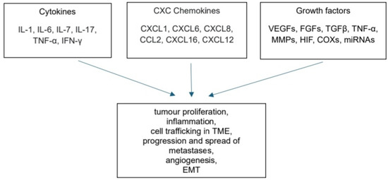 Cytokine/chemokine profile in PCa progression. C and X represent cysteine and non-cysteine residue; VEGFs = Vascular endothelial growth factors; ILs = Interleukins, MMPs = Matrix metalloproteinases; FGFs = Fibroblast growth factors; TGFβ = Transforming growth factor beta; TNF-α = Tumor necrosis factor alpha; IFN-γ = Interferon gamma; COXs = Cyclooxygenases; miRNAs = microRNAs; HIF = Hypoxia inducible factor; TME = tumor microenvironment; EMT = epithelial–mesenchymal transition.