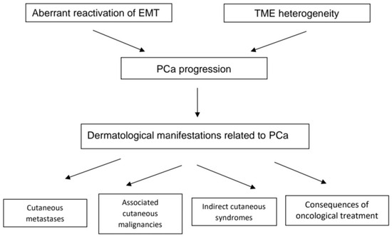 Dermatological conditions related to PCa (EMT—epithelial–mesenchymal transition; TME—tumor microenvironment; PCa—prostate cancer).