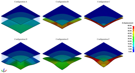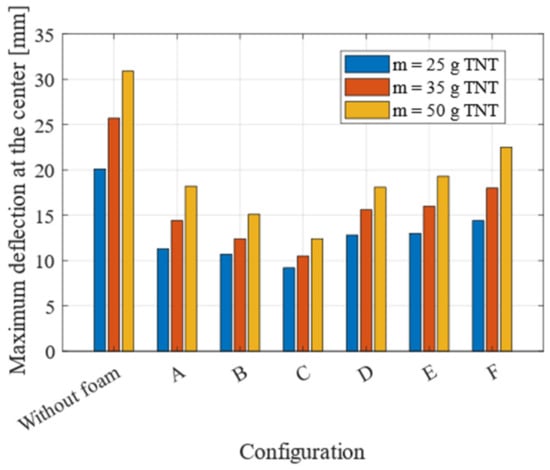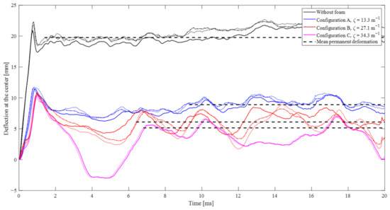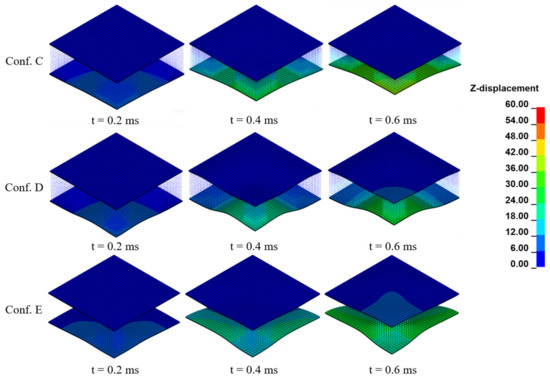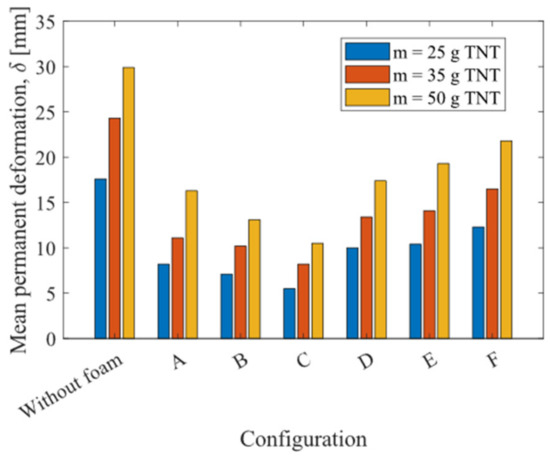 - The sacrificial cladding exhibits a favorable protective effect on the aluminum plate, reducing the maximum deflection and mean permanent deformation at the center of the plate by at least 30% in configuration F and up to 70% in configuration C.