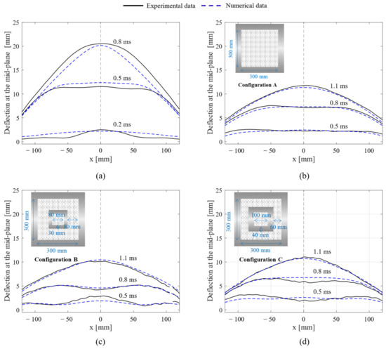- The numerical model accurately reproduces the deflection profile at mid-span with a relative error of about 5%. Notably, the SPH approach proves to be robust in predicting the experimental results.