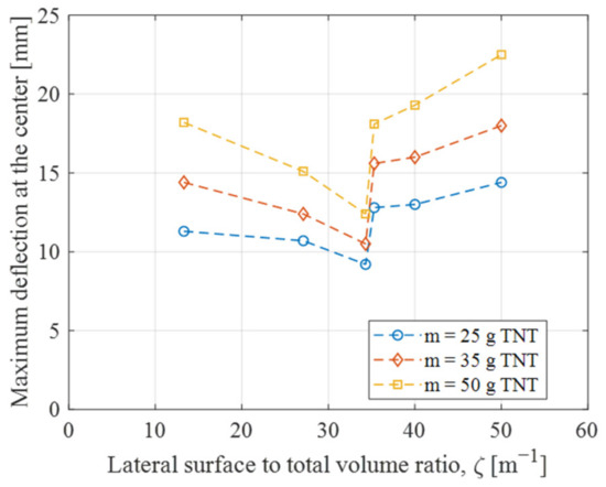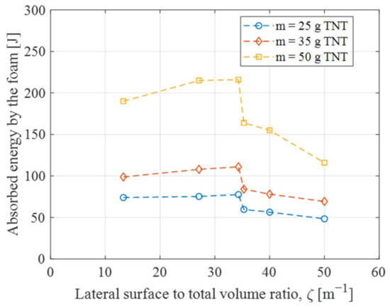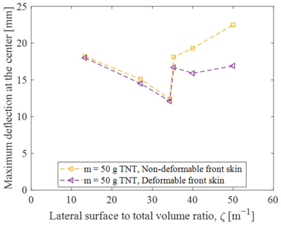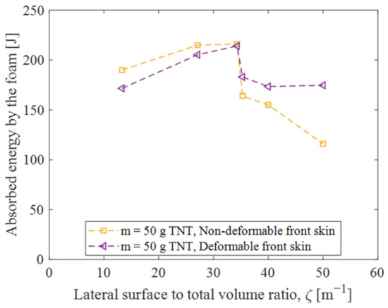 - The foam configuration significantly influences the energy dissipation of the sacrificial cladding. Specifically, increasing the ζ value, denoting the ratio of the foam’s lateral surface to its total volume, results in an enhanced protective effect of the cladding. However, when ζ exceeds an optimal value, the performance of the SC is decreased. This optimal ζ value minimizes the maximum deflection and permanent deformation while maximizing the absorbed energy by the foam. The SC’s decrease in effectiveness is primarily due to excessive front skin deformation leading to non-uniform foam crushing.