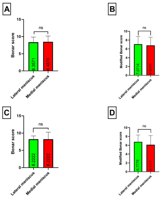 Similarly, in the varus deformity group, no statistically significant differences were observed in the Bonar score (p = 0.2868) or its modification assessing both menisci (p = 0.4907) (Figure 1E,F). Specifically, the mean classical Bonar score for the medial meniscus in varus deformity knees was 8.5, and for the lateral meniscus, it was 8.3. Regarding the modified Bonar score, the mean score for the medial meniscus was 7, and for the lateral meniscus, it was 7.1 (p = 0.4907).
