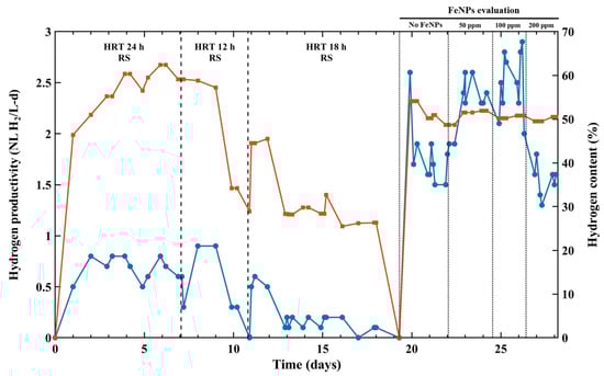 The continuous reactor performance is described based on the experimental steps of reactor stabilization followed by FeNPs nanoparticle evaluation. Figure 2 illustrates the overall process of continuous operation. During the initial experimental period, the reactor was operated for 24 h to promote the adaptation of the microbiota. After 7 days of continuous operation, H₂ productivity reached 0.7 ± 0.1 NL H₂/L-d, with an average hydrogen content of 58.2 ± 3.7%. In addition to H2, CO₂ was present in the gas composition, while other gases, such as H2S and CH4, were not detected. After reaching a pseudo-steady state, the HRT condition of the reactor was changed to 12 h. The reactor responded positively to this change, reaching a maximum productivity of 0.9 ± 0.1 NL H2/L-d after 2 days; however, a steep decline in H2 production was observed until the complete process collapsed. To promote the growth and activity of acidogenic communities in the reactor, a batch recovery period with lactose (as the sole carbon source) was performed for three days. After this period, the continuous operation mode was restarted, still feeding with lactose as the sole carbon and energy source, with an HRT of 12 h. During this phase, the reactor reached a maximum productivity of 5.6 NL/L-d, indicating the presence of active H2-producing communities. After two days of reactor recovery, there was a sudden drop in H2 productivity associated with the replacement of the lactose-based growth medium with RS hydrolysates and the shortening of HRT to 18 h. It is important to note that lignocellulosic material subjected to acid pretreatment typically generates a significant amount of inhibitors, including furfural, HMF, and other phenolic compounds. Furfural concentrations can range from 0.03 to 8.23 g/L and HMF concentrations from 0.09 to 1.59 g/L [32], often exceeding the inhibition threshold for DF processes, which is approximately 1 g/L [32]. In this context, several techniques have been developed to remove inhibitors prior to substrate utilization in DF systems [33]. Among these methods, over-liming involves the precipitation of inhibitors with Ca(OH)2. Enhanced pretreatment efficacy is achieved through a combination of high pH and temperature over a prolonged period of time. This approach has been recognized as a promising detoxification method for dilute sulfuric acid pretreated lignocellulosic biomass hydrolysate [34]. In addition, over-liming has been used to remove inhibitors from sulfuric acid hydrolysates derived from RS [28]. Based on these considerations, an over-liming treatment was applied to avoid reactor inhibition.