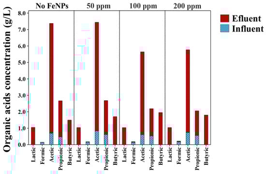Soluble metabolites identified in the effluent of the DF reactor across all operational stages included lactate, formate, acetate, propionate, and butyrate (Figure 3). Regardless of the nanoparticle concentrations tested (0, 50, 100, and 200 ppm), the predominant metabolites produced were acetate, butyrate, and propionate, as shown in Figure 3. Notably, a consistent lactate concentration, averaging around 1.0 g/L, was observed throughout all processes, independent of the nanoparticle condition. This consistency suggests that while nanoparticles may influence the enzymatic pathways associated with H2 production, they do not disrupt or impact the metabolic pathway responsible for lactate production, nor do they affect the enzymes involved in its synthesis.
