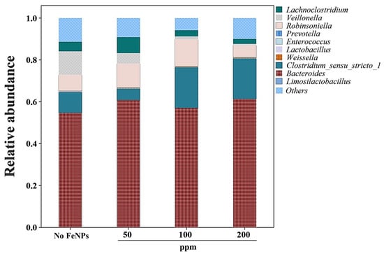To identify the microorganisms involved in the DF process, a comparison of relative abundance across different process conditions was conducted (Figure 4). The analysis at the genus level revealed that Bacteroides consistently dominated the microbial community, with relative abundance varying slightly depending on the nanoparticle conditions, ranging from 55% to 65%. Bacteroidetes, the phylum to which Bacteroides belong, are known as proteolytic bacteria and are likely involved in the degradation of various proteins. These proteolytic microorganisms have the capability to metabolize amino acids, leading to the production of volatile fatty acids (VFAs) such as acetate, propionate, succinate, and ammonia (NH₃) [41].