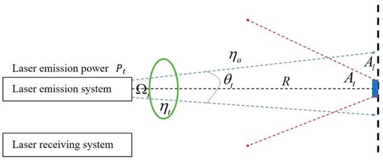 Lidar could measure the range by emitting laser pulses to the target object and processing the laser echo received from the reflective surface. The distance between the target and the lidar is set to be , the divergence angle of the emitted laser beam is set to be , the stereo angle is set to be , the transmittance of the emitting optical system is set to be , the transmittance of the receiving optical system is set to be , and the transmittance of the laser pulse in the atmosphere is set to be . The effective area of the target at the cross-section of the laser beam is , the steric angle is , the cross-sectional area of the laser beam at the target position is , the normal direction of the target is ON, the angle between the optical axis of the launching optical system and the target normal direction ON is , and is the area of the detector’s photosensitive area. The laser emission process is shown in Figure 2.