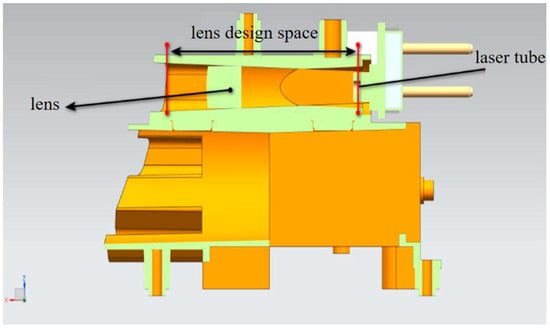 Based on the principles of Section 2.1 and project requirements, a lidar system for application on a vehicle has been designed, as shown in Figure 4. It can be seen that the optical system is placed on the top. The laser selected in the system has a wavelength of 905 nm and an output power of 25 W, with a x-direction spot size of 10 µm and a divergence angle of 15°, and a y-direction spot size of 50 µm and a divergence angle of 33°. Due to the emission angle of the light source being asymmetrical, the beam needs to be strictly collimated in order to achieve accurate measurements. This means the laser spot should be converted into a circular spot with symmetrical long and short axes (close to a circle at different positions within 30 m). Therefore, according to the requirement of the system structure, a collimated lens should be designed and placed in the lens design space shown in Figure 4.