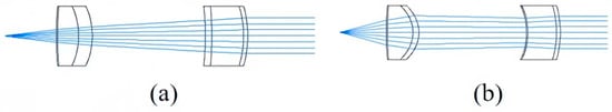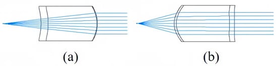 Currently, conventional lidar optical systems [,] are designed to meet the detection needs of roads, but as the distance increases, is it not only difficult to ensure the compression and collimation effect of the beam [,,], but the requirements for the imaging system also become more stringent. Zhang et al. designed a lightweight, compact and non-thermalized four-piece all-glass telephoto lens, combining the telephoto lens with a line-array detector, to significantly improve the detection resolution of lidar systems through local image-level imaging and satisfy the temperature adaptability of vehicle-mounted lidar in complex environments []. Zhu et al. designed a four-element, three-group, tenside-type vehicle lens to meet the requirements of intelligent vehicles in terms of recognition accuracy and imaging quality for close-range targets in front of them by varying the distance and curvature of the lens []. Xu et al. proposed a method of optical design parameter optimization to design a matching aspherical surface shape structure to improve the laser echo signal detection capability. The contradiction between the optical system size and the collimation and focusing effect was solved for the near-field conditions and the on-board state interference []. All of the above studies can prove that the optical design system of vehicle-mounted lidar at close range has good imaging capability and image quality, but there are still relatively few studies on the imaging system at long range.
