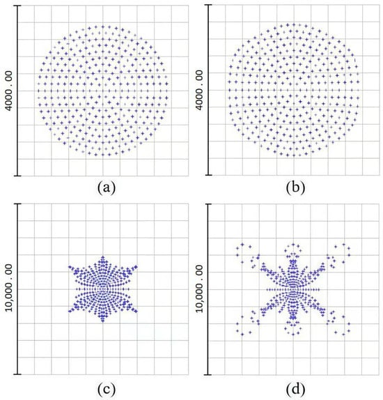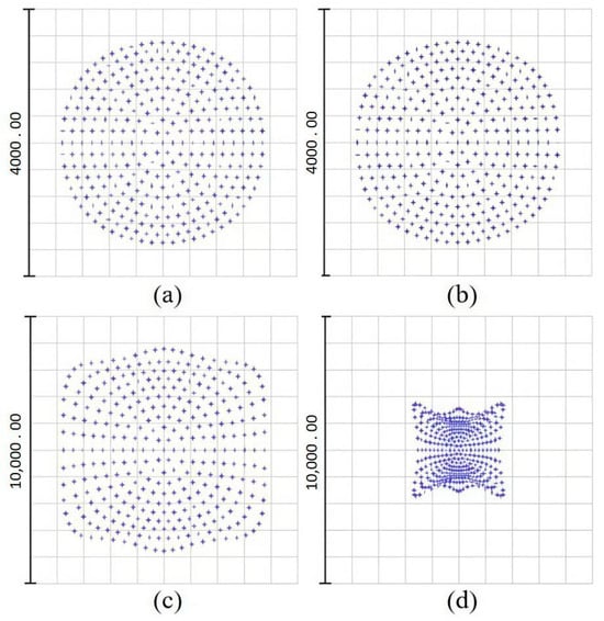 In this paper, two schemes are compared, of which Figure 6 uses a single lens, and after simulating the ray tracing, the spot diagram shows that spot shapes have become dispersed on the image plane at a distance of 30 m. Therefore, on the basis of Figure 6, the lens is optimized and a system with two lenses is adopted; after simulating ray tracing, the spot shape is basically circular on the image plane. Compared to a single lens, a pair of lenses can better achieve the imaging requirements at a long distance.