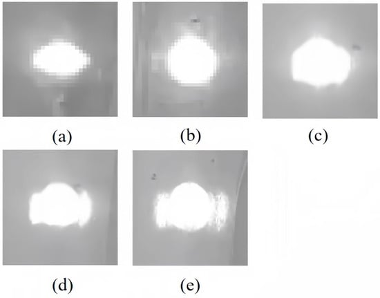 Spot shape display. (a) indicates that the ground glass is placed at the position of 0.5 m from the lidar center, (b) indicates that the ground glass is placed at the position of 3 m from the lidar center, (c) indicates that the ground glass is placed at the position of 5 m from the lidar center, (d) indicates that the ground glass is placed at the position of 7 m from the lidar center, and (e) indicates that the ground glass is placed at the position of 10 m from the lidar center.