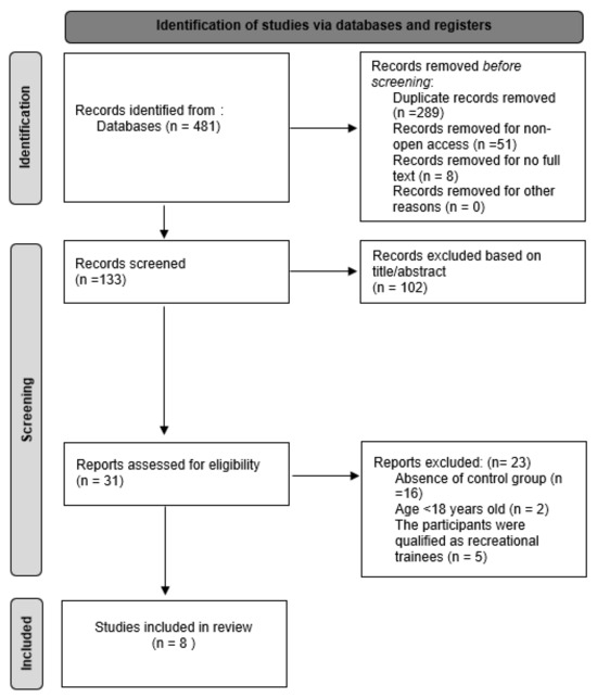 The studies included in the review were selected according to the following PICO(s) criteria, with a focus on ensuring methodological rigor. Articles were excluded if they lacked full-text availability, were not published in peer-reviewed journals, or if the study design did not include a control group. Additionally, non-English language studies and those with sample sizes below 10 participants were excluded to minimize bias (Ł.R. conducted the process of establishing the following criteria). Detailed criteria are presented in Table 1.