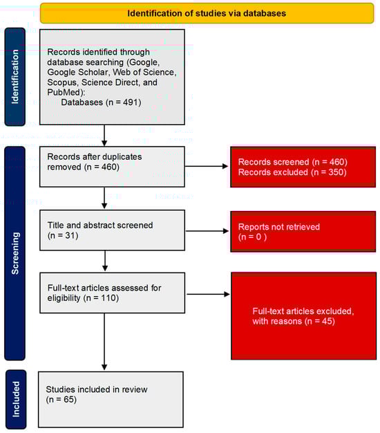 A comprehensive search of databases spanning from 2000 to 2024 was conducted. The studies included in this review, focusing on coal mining safety, were sourced from Google, Google Scholar, Web of Science, Scopus, Science Direct, and PubMed. The search terms used included coal mining safety, safety issues, energy crisis, indigenous coal resources, power consumption, coal mine fatal accidents, safety measures, artificial intelligence, human error in mining, human behavior, and mining safety in Pakistan and the world. A total of 65 articles from 2000 to 2024 were thoroughly reviewed. Figure 1 presents the preferred reporting items for systematic reviews and meta-analyses (PRISMA) diagram, illustrating the screening process findings.