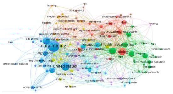 To identify the most significant keywords in the coal mining safety field, this research conducted a co-occurrence analysis of popular keywords that frequently appear together in the same article. The ‘full counting’ method was used to evaluate the author’s keywords listed below the abstract, assigning equal weight to each co-occurrence link. Using the VOSviewer software 1.6.20, 2412 keywords were identified across 491 publications. Figure 2 illustrates the 110 keywords that exhibit the highest co-occurrence frequency, considering a minimum threshold of three occurrences. In this figure, each keyword is represented by a node, and the size of the node corresponds to the number of articles in which those keywords are featured. Larger nodes indicate that the associated keywords are more prevalent in the literature. The lines connecting the nodes vary in thickness; thicker lines signify a greater frequency of co-occurrences, highlighting pairs of keywords that often appear together in the same articles. This visualization enables us to discern relationships between concepts more clearly. In the network diagram, shorter distances between nodes indicate stronger associations. The closeness of nodes represents how frequently two keywords co-occur in the articles. Additionally, the colors of the node denote that the keywords belong to the same clusters. This clustering provides insight into the interconnectedness of various topics within the literature, revealing important trends and areas of focus in the research landscape.