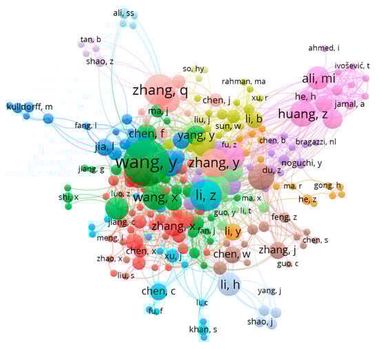 Figure 3 presents a co-occurrence network graph that visually represents the relationships among authors and keywords extracted from the publications. This figure displays the 220 authors with the highest co-occurrence frequency, considering a minimum of two documents per author. Out of the 2189 authors, 267 meet this threshold. Nodes correspond to authors and keywords, with their sizes proportional to their frequencies. The connections between nodes indicate co-occurrences in the publications, with thicker lines denoting stronger relationships. Different colors are used to highlight clusters of authors and keywords that frequently appear together. Central nodes such as ‘Wang, y’ and ‘Li, z’ highlight influential authors and their associated keywords, while peripheral nodes indicate less frequent associations. This visualization effectively depicts key authors, prominent research topics, and the overall intellectual structure of the field. Understanding these collaboration networks is essential for recognizing influential researchers and research groups driving innovation. Furthermore, by mapping out these relationships, the diagram serves as a strategic tool for identifying potential future collaborators or untapped areas for interdisciplinary partnerships. Such insights can help shape future research directions, ensuring that knowledge is not developed in isolation but through a broad, collective effort that maximizes impact and efficiency. For researchers looking to expand their collaborative networks or institutions aiming to foster strategic partnerships, this type of analysis is invaluable.