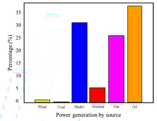 Mining safety is crucial for the sustainable development of coal resources. Unsafe conditions, often worsened by outdated methods and inadequate safety regulations, lead to accidents that cause both human and economic losses while also disrupting coal production. Without prioritizing safety, scaling up coal extraction to meet growing energy demands becomes impossible. Implementing proper safety protocols and modernizing equipment will not only protect workers but also enhance the productivity and efficiency of coal mines. As mentioned earlier, in Pakistan, both the domestic and commercial sectors experience significant power outages lasting approximately 8 to 12 h every day. These outages are a result of insufficient power generation capacity in the country. Coal is a cheap source of energy, and Pakistan possesses a substantial quantity of it. Nevertheless, little attention has been paid to the development of the coal mining sector by the government for the appropriate utilization of coal. Table 1 highlights the total coal resources in Pakistan []. Figure 4 shows that coal contributed only 0.14% of power generation in 2013–2014, which is considerably little compared to the massive coal reserves in the country. Hence, the proper utilization of coal may boost the economy by reducing the energy crisis in Pakistan []. According to 2015 statistical data from the International Energy Agency (IEA), in Pakistan, hydropower (30.7%) and oil (37.2%) are the key sources of power generation, followed by natural gas (25.7%), nuclear energy (5.5%), wind energy (0.8%), and coal (0.14%).