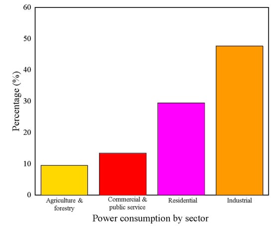 In Pakistan, the main power consumers are the industrial, commercial, agricultural, and residential sectors, and the demand is expected to grow exponentially over the next 30 years [,,,]. Figure 5 presents the total power consumed by different sectors in Pakistan, such as the industrial, commercial and public service, agriculture and forestry, and residential sectors, which consumed 47.72%, 13.38%, 9.47%, and 29.43%, respectively.