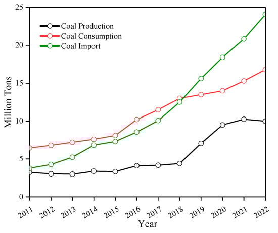 Coal production, consumption, and import from 2011 to 2022 in Pakistan.