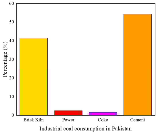 The country is currently faced with three main issues, i.e., (1) a gap in coal supply and demand, (2) the import of coal, and (3) expensive energy. The solution to these issues lies in utilizing the indigenous coal resources of the country. In 2022, Pakistan’s total annual coal production reached approximately 10 million tons. Despite this, the country’s energy needs necessitated the import of around 24 million tons of coal, as illustrated in Figure 6 (data source: [,,,]). This significant reliance on imports underscores the growing demand for coal to meet the nation’s energy requirements. Keeping in view that the demand for coal is too high and is increasing every year, the supply is still significantly low. As discussed earlier, coal is an economical source of energy, and its adequate utilization could replace the expensive sources of energy for different industrial purposes like power generation after the cement brick kiln industries. In Figure 7 (modified after []), it can be seen that the top consumers of coal are the cement and brick kiln sectors, with 54.30% and 41.50%, respectively. Next, the remaining amount of coal is consumed by coke and power generation, with 1.70% and 2.50%, respectively. According to the Worldometer estimation [], the total consumption of national coal is 0.3%; however, 99.7% of proven coal reserves are still untapped due to a lack of modern technology, financial constraints, and lack of awareness regarding its appropriate development.