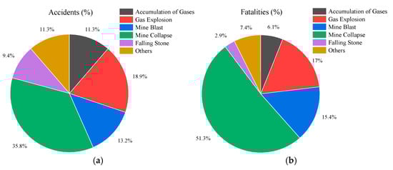 Furthermore, a statistical analysis of coal mine accidents and fatalities in Pakistan was conducted on data from 2010 to 2018 []. Table 2 shows that from 2010 to 2018, a total of 53 accidents resulted in 312 deaths in underground coal mines in Pakistan. Based on Table 2, compared to other territories in Pakistan, major fatal accidents occurred in Balochistan (28 accidents, 219 fatalities) and Khyber Pakhtunkhwa (19 accidents, 77 fatalities) out of a total of 53 accidents and 312 fatalities. An average of six accidents resulted in 35 fatalities each year. In Figure 8, it can be seen that mine collapses accounted for about 36% of the accidents and 51% of the fatalities out of the 53 accidents and 312 fatalities. Gas explosions followed with about 19% of the accidents and 17% of the fatalities, with mine blasts ranking third with 13% of the accidents and 16% of the fatalities. In addition, the accumulation of gases accounted for 11% of the accidents and 6% of the fatalities, falling stones accounted for 10% of the accidents and 3% of the fatalities, and other causes accounted for 10% of the accidents and 7% of the fatalities. The analysis concluded that one key element that culminated in accidents was the negligence and violation of effective safety measures by the administration. Moreover, the fatalities in Pakistan’s mining sector are primarily caused by mine collapse, mine blast, and gas explosion. These disasters highlight the insufficient attention given to implementing strict safety measures by the government of Pakistan and the mine safety authorities. It is crucial to address these issues to make the workplace less hazardous for the workforce, especially in the Balochistan and Khyber Pakhtunkhwa provinces. It must be noted that the available data addressed only the number and apparent causes of the accidents and the consequent casualties. No data addressing the underlying causes leading to these accidents are available.