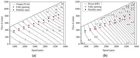 Water pump working condition data points: (a) pump torque operating points and (b) pump power operating points.