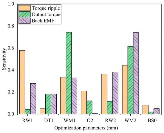Since it was necessary to study the influence of a single parameter on multiple optimization objectives, we introduced a comprehensive sensitivity formula. Considering that permanent magnet synchronous motors have high requirements on torque ripple, and, at the same time, torque ripple serves as an important measure of motor output performance, weighting coefficients were introduced to reflect the importance of different optimization objectives, so as to ensure that the parameters that have greater impacts on torque ripple can be retained. The integrated sensitivity formula is as follows []: