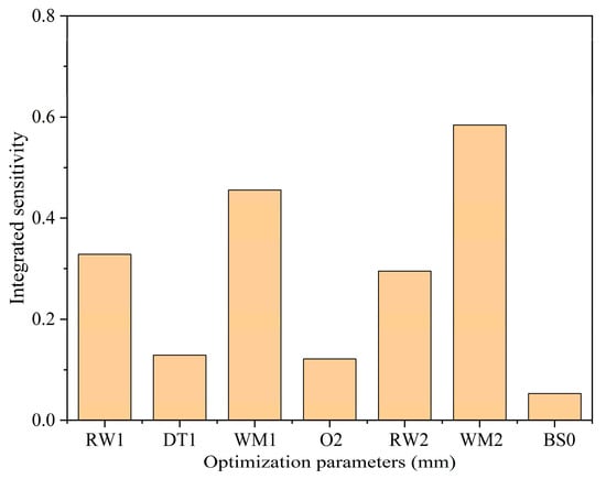 The results of the sensitivity analysis are shown in Figure 5 and Figure 6. The sensitivity values of RW1, WM1, RW2, and WM2 are the highest, and therefore have the greatest impacts on the optimization objective, so they were defined as high-sensitivity parameters, while the remaining three were considered low-sensitivity parameters. The high-sensitivity parameters were optimized using CGE-SSA, and the low-sensitivity parameters were optimized in a parametric way.