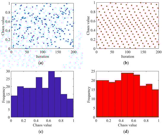 Population distribution map: (a) random population distribution; (b) circular sinusoidal chaos map population distribution; (c) histogram of randomized population distribution; and (d) histogram of circular sinusoidal chaotic mapping population distribution.
