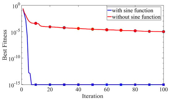 In order to verify that the sinusoidal function can expand the search space, and thus improve global optimization ability, the benchmark test function f10 was used to compare the optimization ability of the algorithm with and without the sinusoidal function []. The number of populations was set to 100, the maximum number of iterations to 100, with the cycle recurring 50 times, and the function f iteration curve is shown in Figure 9, where it can be seen that, when there is a sinusoidal function, the iteration curve converges to 8.88 × 10−16; meanwhile, when there is no sinusoidal function, the iteration curve does not converge, and the optimal value of the search is 1.01 × 10−5. It can thereby be concluded that the position updating formula can effectively improve the algorithm’s convergence speed and accuracy when there is a sinusoidal function.