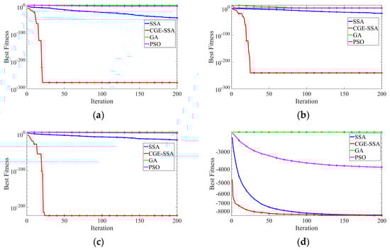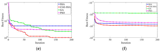 The results of 50 experiments are shown in Table 7 and Figure 11. In Figure 11a–c, all three functions are single-peaked functions, so the iteration curves of the algorithms are closer. In Figure 11a–d, it can be seen that the iterative curves produced using the four functions of CGE-SSA converge at the 22nd, 21st, 25th, and 28th generations, respectively. The four function iteration curves produced using SSA do not converge, and the last generation results are 2.3 × 10−67, 1.6 × 10−30, 3.09 × 10−41, and −7874.28. The f1, f2, and f3 function curves produced using GA converge, and the convergence results are 30,717, 69.7, and 59,675. The f1 and f2 function curves produced using PSO also converge, and the convergence results are 21.3 and 20.06. As can be seen in Figure 11c,d, the convergence speed and accuracy of the CGE-SSA iterative curves are significantly higher than those of other algorithms.