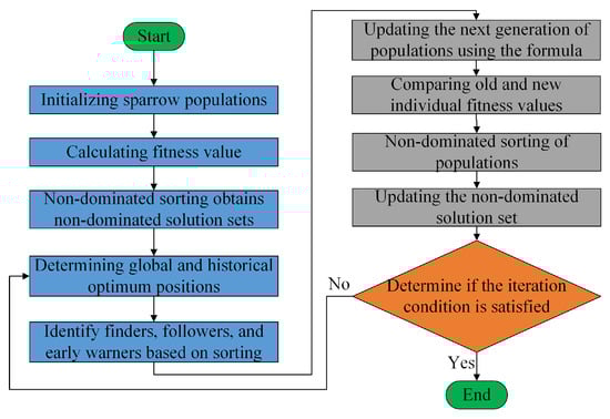 In contrast to the single-objective algorithm, the fitness values of individuals in the multi-objective algorithm are determined through multiple indicators, which cannot be directly compared to derive the optimal individual. Therefore, by adding a non-dominated sorting procedure and a congested space calculation procedure to CGE-SSA, the comparison of fitness values between multi-objective individuals is realized, and the non-dominated solution set is output to form an improved multi-objective sparrow search algorithm, the optimization flowchart of which is shown in Figure 12.