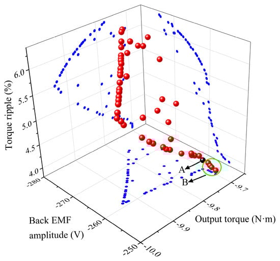 According to the optimization objective and its constraints, set in Section 2.1, five optimal solutions were obtained, shown as point A and region B in the Pareto frontier chart. Among them, both point A and region B satisfy the requirement that the output torque is greater than 9.7 Nm, and the output torque of point A is slightly higher than that of region B. In addition, the torque ripple values at neither point A nor region B exceed 4%, which indicates a good output stability. Compared with the torque ripple and the output torque, the back EMF amplitude at point A differs greatly from that in region B, reaching 257.5 V. Therefore, point A was taken as the optimal solution point.