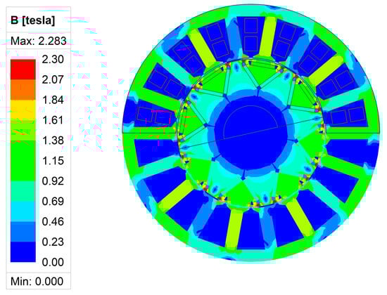 As can be seen in Table 8, within the reasonable variation range of the structural parameters, the optimized motor models using the four algorithms meet the requirements of the optimization objectives, and the torque ripple and back EMF amplitude are significantly improved, compared to the pre-optimization results, in terms of satisfying the output. Compared with the optimization results of SSA, GA, and PSO, the motor optimized with CGE-SSA has a lower torque ripple, higher back EMF amplitude, and higher output torque. In Figure 14, it can be seen that the magnetization density amplitude of the stator tooth part is about 1.6 T, and that of the yoke part is about 1.3 T, after optimization with CGE-SSA, and the magnetization density distribution is good; meanwhile, the rotor spacer bridge is saturated with magnetic density near the spacer bridge, which can effectively suppress magnetic leakage. Therefore, CGE-SSA demonstrates better optimization results than SSA, GA, and PSO, resulting in a better output performance for the optimized motor.
