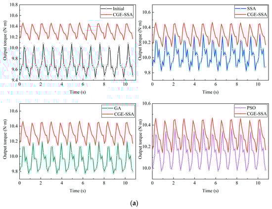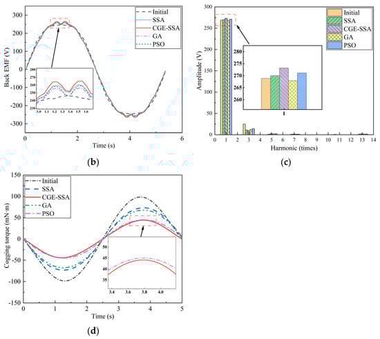 As can be seen in Figure 15a, the red curve sits above the other curves, demonstrating that the average output torque after optimization using CGE-SSA is higher than those after optimization using the SSA, GA, or PSO, with levels of 10.31 Nm, 10.02 Nm, 9.94 Nm, and 10.14 Nm, respectively (all increased from the initial value of 9.7 Nm, which satisfies the output requirements), and that the average output torque after optimization using torque fluctuation is lower after optimization using CGE-SSA. It is thus proven that, compared with other algorithms, the output of the motor optimized with CGE-SSA is smoother, and the optimization effect is more obvious. Compared with the pre-optimization motor, the torque ripple of the motor after CGE-SSA optimization decreased, from 6.62% to 3.11%, a decrease of 53%. In Figure 15b,c, it can be seen that, compared with SSA, GA, and PSO optimization, the reaction potential amplitude of the CGE-SSA-optimized motor is higher and its distortion rate is lower. Compared with the initial motor, the back EMF amplitude increased, from 245.2 V to 265.01 V, an increase of 19.81 V. The fundamental amplitude increased, from 268 V to 273 V; the 3rd harmonic decreased from 24.8 V to 8.2 V; and the distortion rate decreased, from 9.2% to 3.8%, a decrease of 58.7%. The increase in the reaction potential can effectively improve the overall efficiency of the motor, and the decrease in the distortion rate can improve the sinusoidal degree of the reaction potential waveform, thus improving the stability of the motor output. As shown in Figure 15d, the cogging torque of the CGE-SSA-optimized motor is greatly reduced, which is similar to the result after optimization using PSO. Compared with the initial motor, the cogging torque amplitude decreased, from 98.7 mNm to 44.1 mNm, a decrease of 55%, which would greatly reduce the vibration and noise of the motor. The above comparative analysis proves that the optimization effect of CGE-SSA is better than those of the SSA, GA, and PSO, and the smoothness of the optimized motor output is significantly improved, with a better overall output performance.