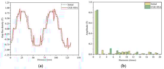 Comparison before and after optimization: (a) air-gap magnetic density comparison and (b) harmonic comparison.