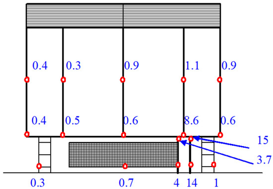 Experimentally measured values of the magnetic field intensity H in [A/m] at the 15/0.4 kV/kV transformer station. The red circles in the side view indicate the measurement points.