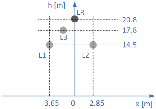 Distribution of cables (working cables L1, L2 and L3 and a grounding wire LR) in the 110 kV line in the middle of the span between the poles. The distances in the drawing (in meters) are given from the base of the power pole.