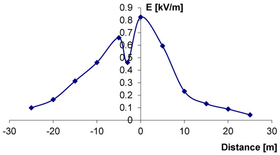 During measurements at a height of 2 m above the ground in the middle of the span, the results were obtained as shown in Figure 3. The coordinates on the x-axis match the data from Figure 2. The maximum value of E is 0.83 kV/m. It should be also mentioned that in a specific position under two line wires placed one above the other, E reaches a value of 0.66 kV/m due to the screening properties of EFs emitted by the wires.
