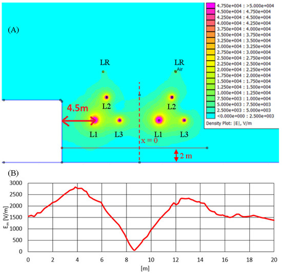 Results of numerical simulations for the distribution of the electric field intensity E: (A) coordinates of suspension of wires of span 51–52 in the vicinity of the warehouse (phase wires L1–L3, shield line—LR). The earth potential of 0 V was assumed on the walls and roof of the warehouse. The red line marks the height of 2 m above the ground. (B) Electric field level at a height of 2.0 m above the ground according to the profile given in Figure 4A) (solid red line) calculated for catastrophic conditions assuming a height of 5.8 m for the lowest conductors above the ground.